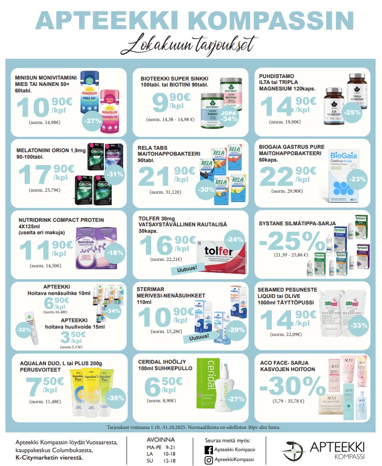 Apteekki Kompassin löydät Vuosaaresta, Kauppakeskus Columbuksesta K-Citymarketin yhteydestä, pullonpalautuksen vierestä.